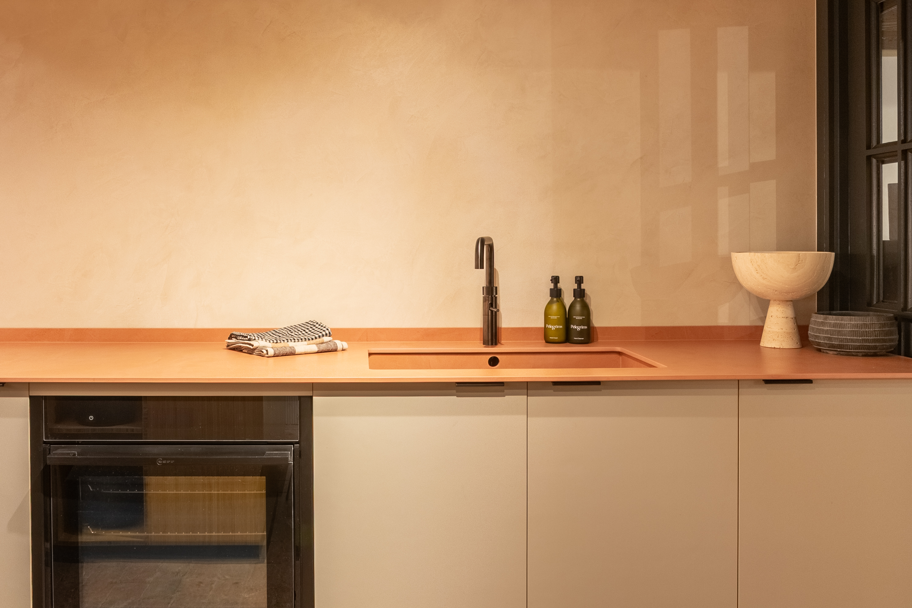 The Alistair Fleming showroom is a Grade II-listed historic building. The space posed some interesting design challenges: there is no natural light, and the ceiling is very low, accentuated by original beams. Designer Ollie Clark responded with an unusual concept - squeezing every element as thin as possible. While most worktops range between 20-30mm, Dekton’s manufacturing process - which uses 25,000 tons of uniform pressure - allows for strong, slim counter tops at just 12mm. The final result is a stop-you-in-your-tracks kitchen that at once feels contemporary and at home in a 200-year-old building.