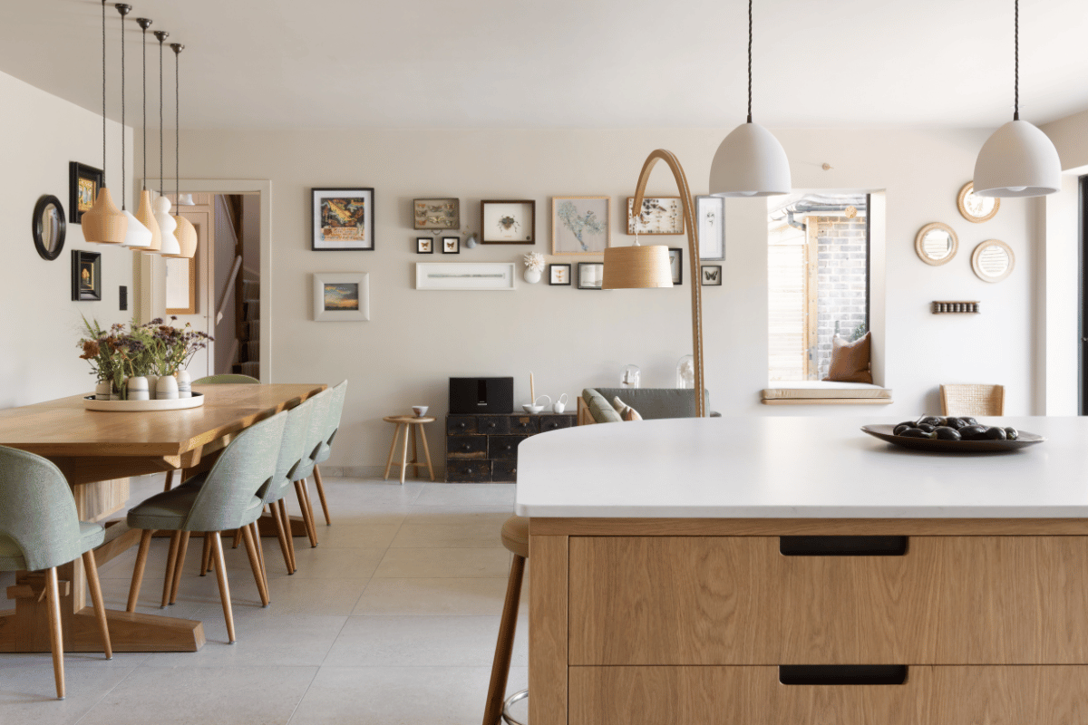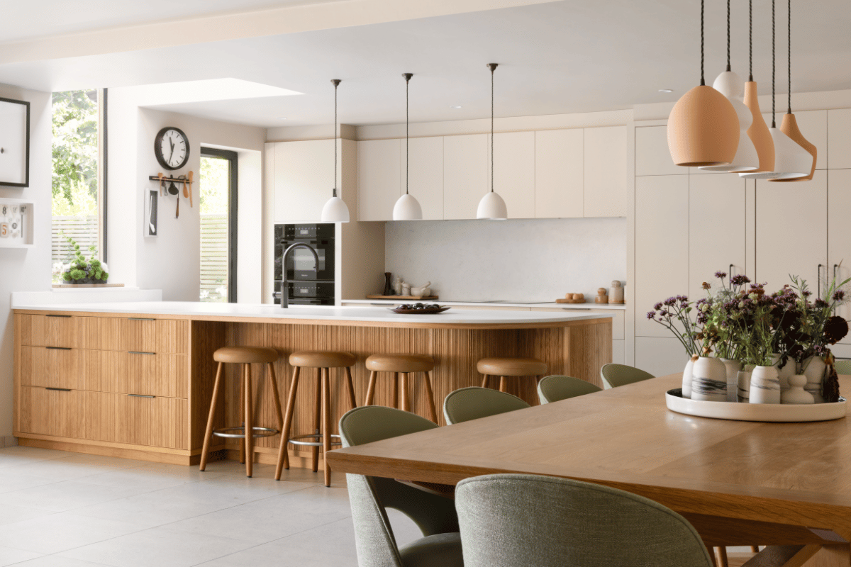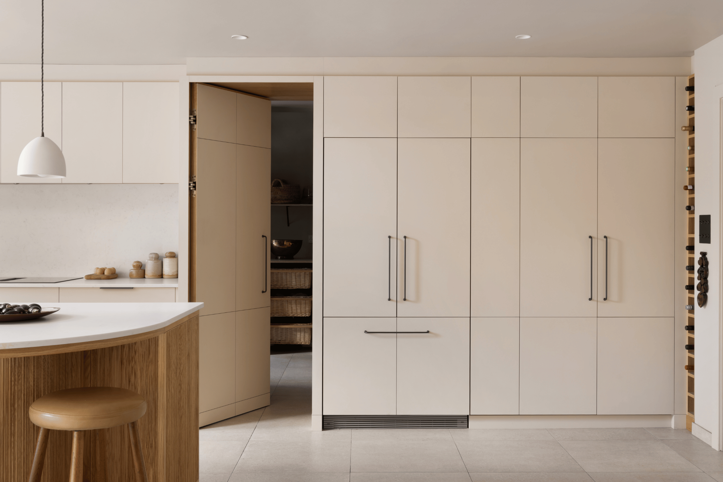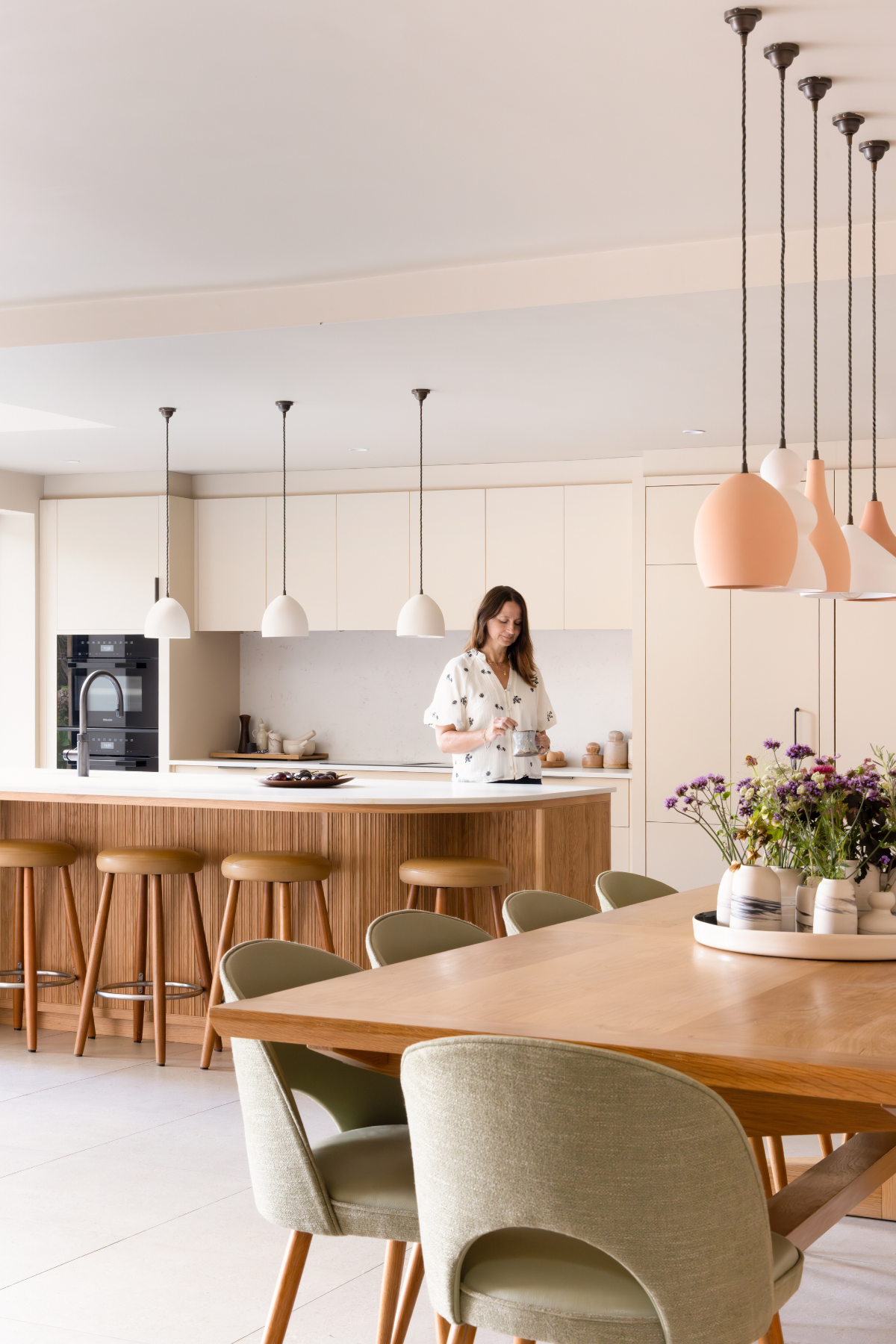 The space was conceived to be social and practical, working in harmony with the surrounding garden, ceramics studio and living areas. Thoughtful features include a concealed utility door, a minimalist cabinet layout with as few handles as possible, and a seamless transition from kitchen to garden patio.